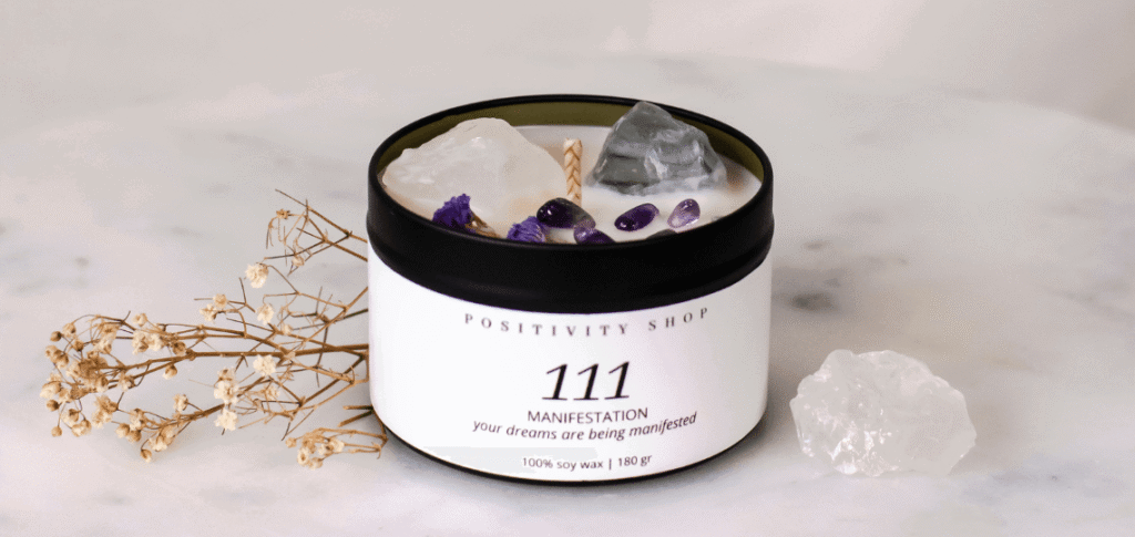 Een kaarsritueel helpt je focussen. Het licht van een kaars staat symbool voor jouw innerlijk vuur. Kies bijvoorbeeld de 111 – Manifestation | Angel Number Edelsteen Kaars. Perfect om je intenties krachtig en liefdevol te verankeren.